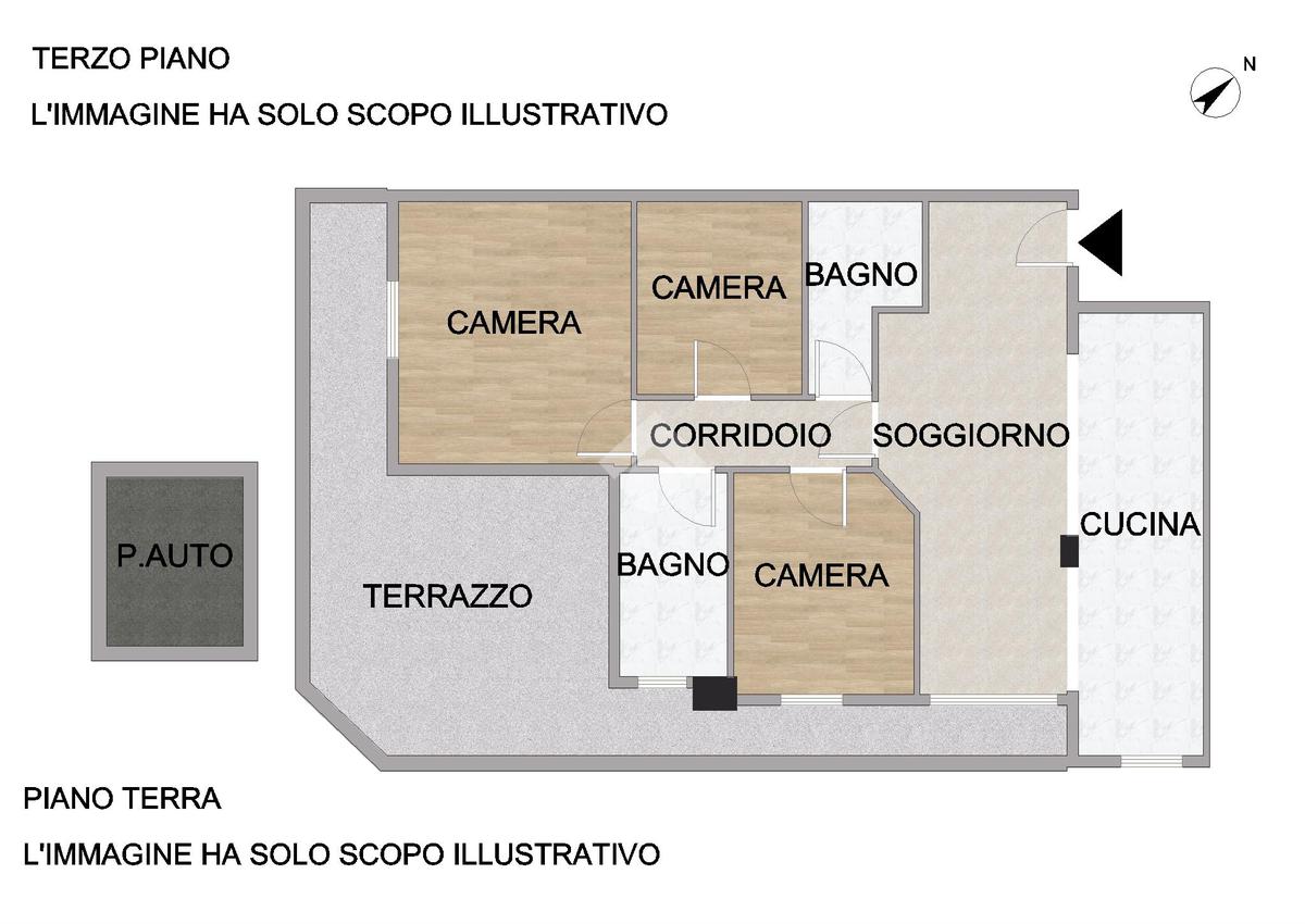 Punto di forza della soluzione sono i due terrazzi: uno ampio e perimetrale, perfetto per vivere gli spazi esterni in ogni stagione, e un secondo terrazzo rialzato, riservato e panoramico, ideale come solarium o aerea relax.